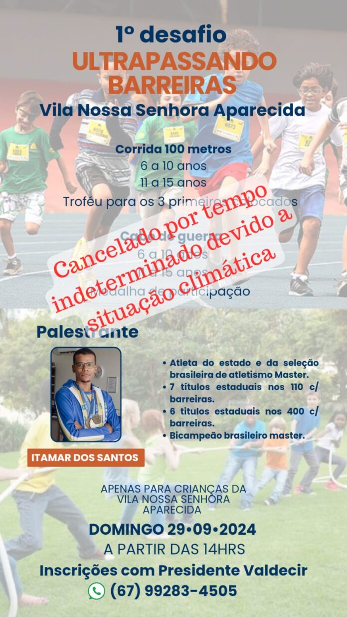 O 1º Desafio Ultrapassando Barreiras, previsto para ocorrer neste fim de semana, na Vila Nossa Senhora Aparecida, em Amambai, foi adiado por tempo indeterminado devido às condições climáticas desfavoráveis.