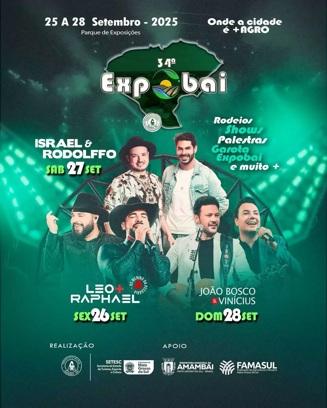 A 34ª edição da Expobai já tem data marcada e promete movimentar a cidade entre os dias 25 e 28 de setembro no Parque de Exposições. Com entrada gratuita pela primeira vez, o evento reúne atrações musicais, rodeio profissional, leilões, palestras, escolha da Garota Expobai, praça de alimentação e diversas outras atividades.