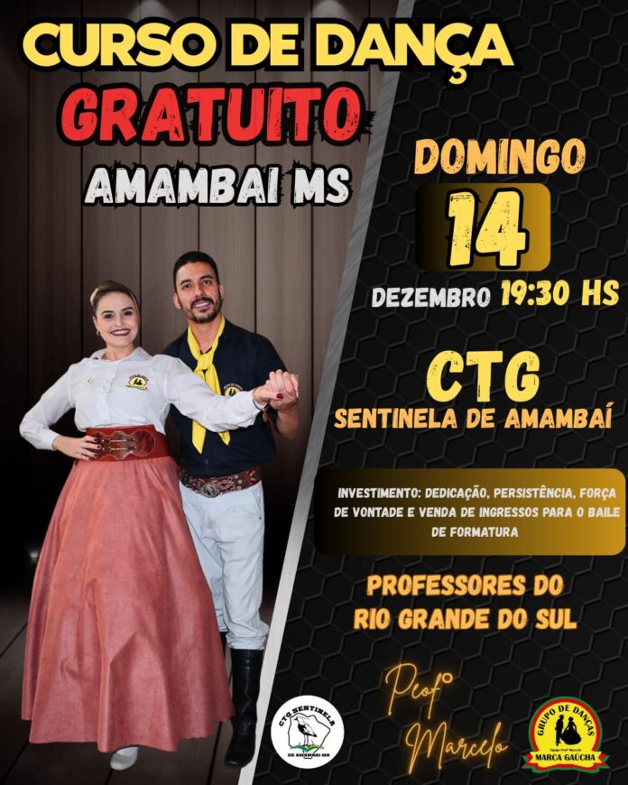 O CTG Sentinela de Amambai inicia neste domingo, 14 de dezembro, um curso de dança gratuito aberto a todas as idades. As aulas acontecem às 19h30, na sede da entidade, e serão ministradas por professores do Rio Grande do Sul.