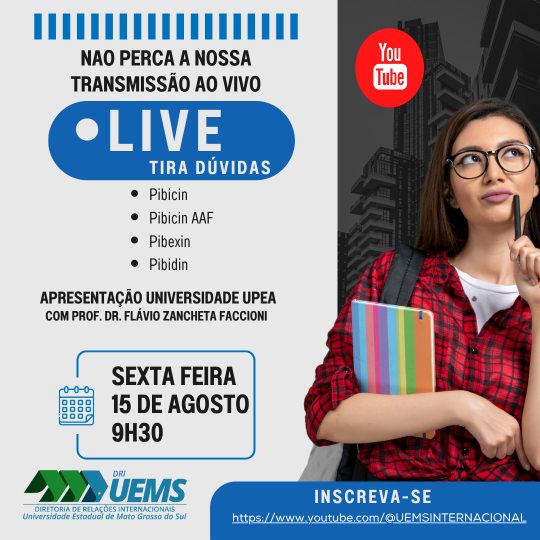 A Universidade Estadual de Mato Grosso do Sul (UEMS), por meio da Diretoria de Relações Internacionais (DRI), realizará, no dia 15 de agosto, às 9h30 (horário de MS), uma live tira-dúvidas sobre os Editais de Mobilidade Internacional 2025. A transmissão será ao vivo pelo canal da UEMS Internacional no YouTube (https://www.youtube.com/@UEMSINTERNACIONAL).