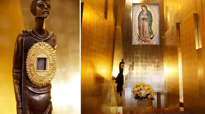 O fragmento da tilma é conservado dentro de um relicário de ouro, incrustrado no coração de uma escultura de são Juan Diego.