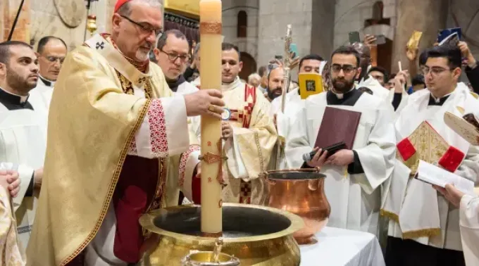 O cardeal Pizzaballa mergulha o círio pascal na água para abençoá-la. Crédito: Marinella Bandini