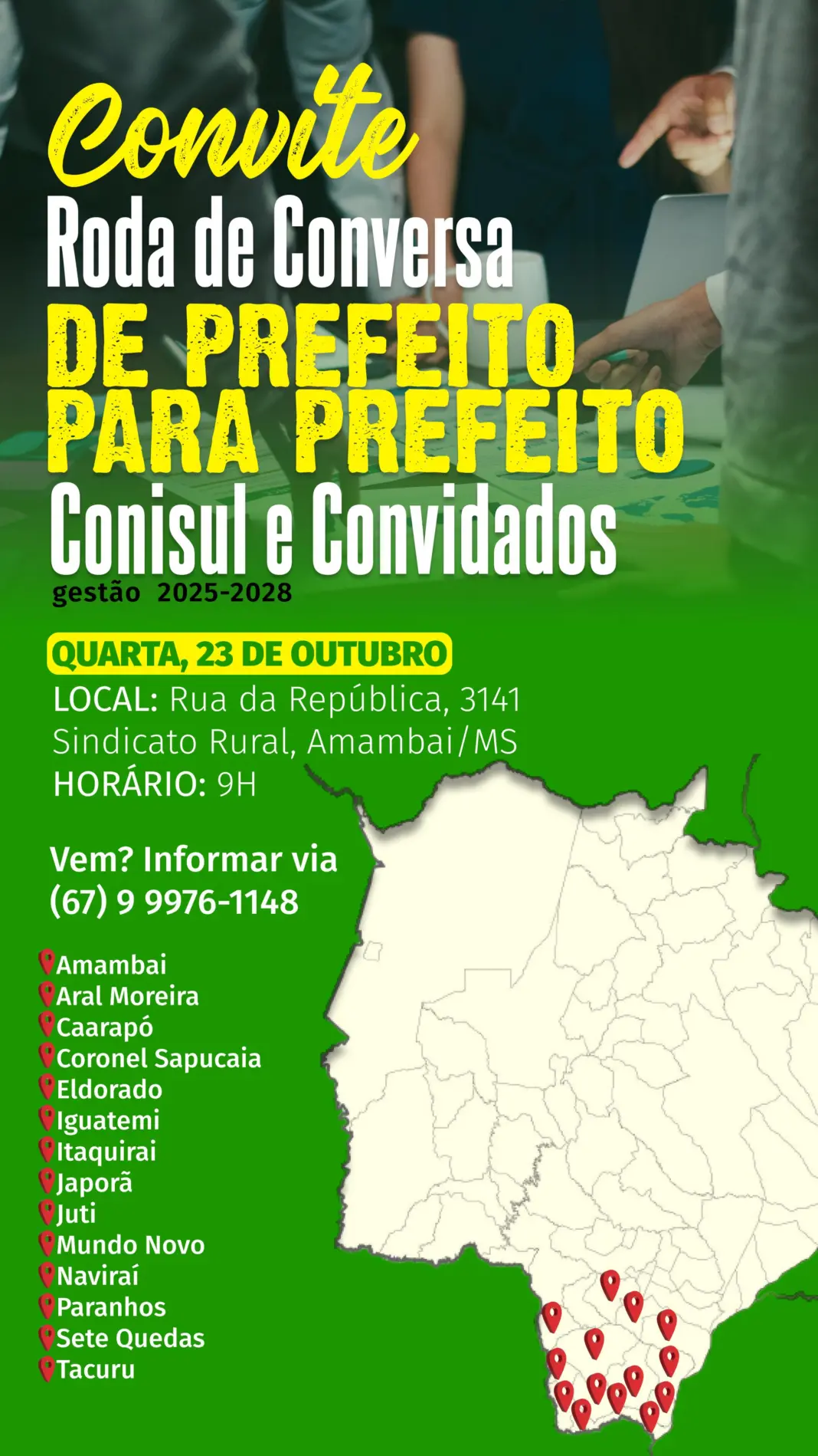 No próximo dia 23 de outubro, prefeitos e vice-prefeitos eleitos em 2024, da região sul de Mato Grosso do Sul, integrantes do CONISUL (Consórcio Intermunicipal de Desenvolvimento da Região Sul), e outros municípios convidados, participarão de uma importante Roda de Conversa em Amambai. O evento, que será realizado no Sindicato Rural de Amambai, às 09h, visa fortalecer o relacionamento entre os novos gestores municipais e alinhar as prioridades de transição e gestão para o próximo mandato (2025 – 2028).