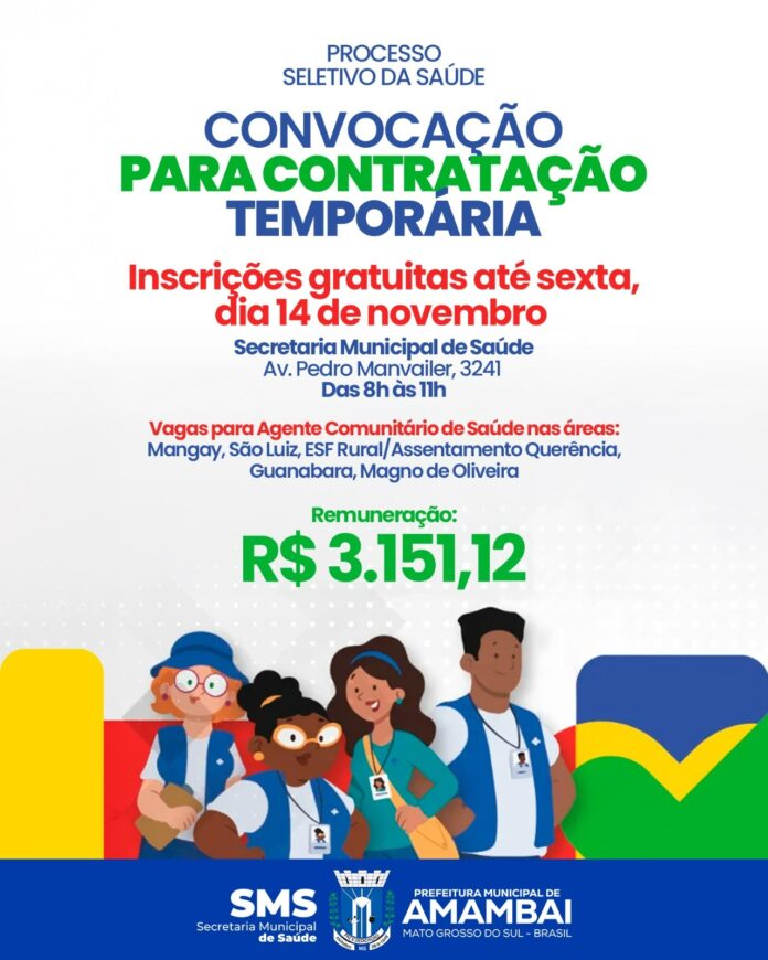 A Prefeitura de Amambai, por meio da Secretaria Municipal de Saúde, publicou o Edital nº 003/2025 convocando candidatos para processo seletivo simplificado destinado à contratação temporária de Agentes Comunitários de Saúde (ACS). As inscrições serão realizadas de 11 a 14 de novembro de 2025, na sede da Secretaria Municipal de Saúde, localizada na Avenida Pedro Manvailer, nº 3241, das 8h às 11h, de forma gratuita.