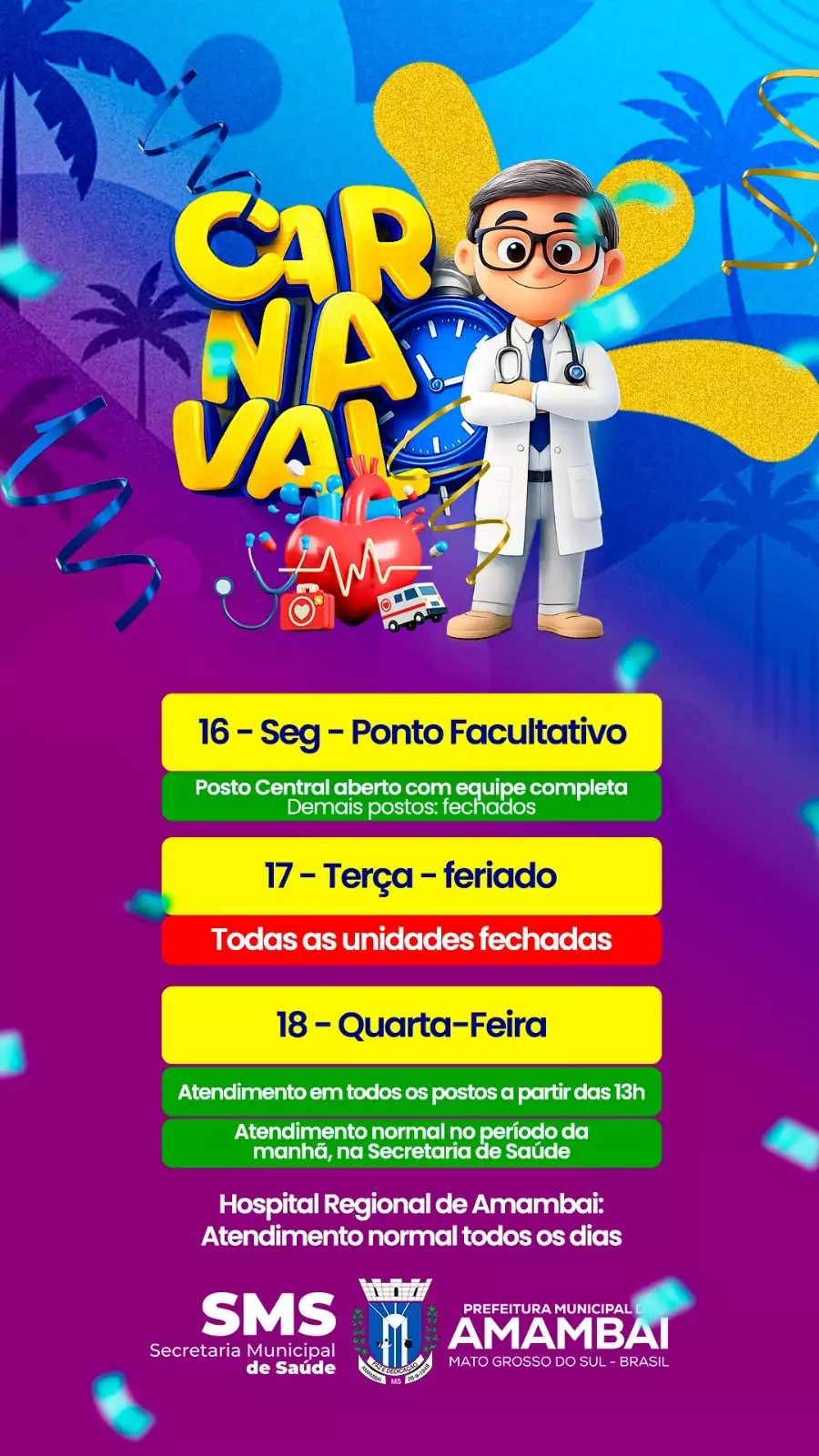 A Prefeitura de Amambai, por meio da Secretaria Municipal de Saúde (SMS), informa à população como será o funcionamento das unidades de saúde durante o período de Carnaval.